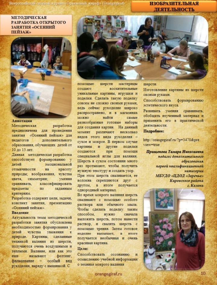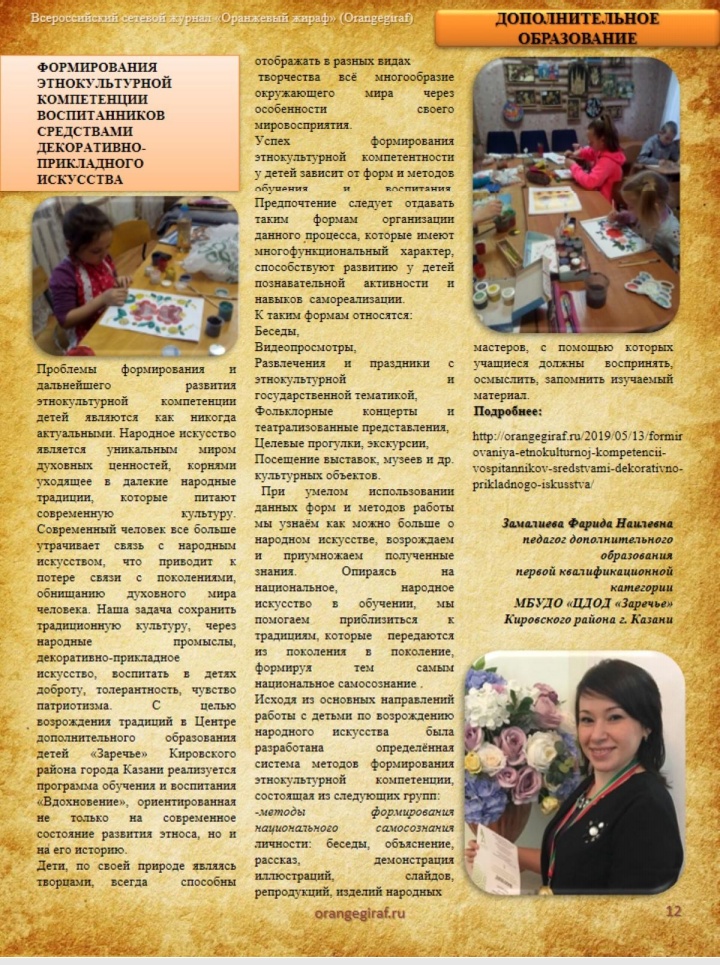 Педагоги "Клуба по месту жительства" Замалиева Ф. Н. объединение "Вдохновение" и Прищепова Т. Н. объединение "Гобелен" поделились своим педагогическим опытом опубликовав свой метериал во Всероссийском журнале "Оранжевый жираф" (Orangegiraf) Публикация ; Публикация 2