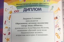Поздравляем Образцовый театр моды «Юнита», педагог Волкова Алла Юрьевна, лауреатов 3 степени Международного конкурса детского и юношеского творчества «Весенние выкрутасы». МОЛОДЦЫ!! Желаем дальнейших успехов!!! -