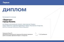 Наша команда «Заречье», состоящая из ребят объединения «Юный Лидер» Движения Первых «ЦДОД «Заречье» награждена дипломом за победу в проекте «Достижения Первых». Конкурс проходил среди первичных отделений Движения Первых Республики Татарстан. В рамках конкурса команда презентовала деятельность своего первичного отделения, рассказала об основных целях, приоритетах и полученных достижениях. Это невероятная радость и гордость для всех участников нашей дружной команды!
