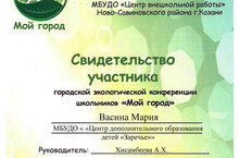 Учащаяся объединения «Исследователи природы» Васина Мария приняла участие в городской экологической конференции «Мой город» с проектом «Чистое озеро — залог здорового отдыха жителей «Салават Купере»