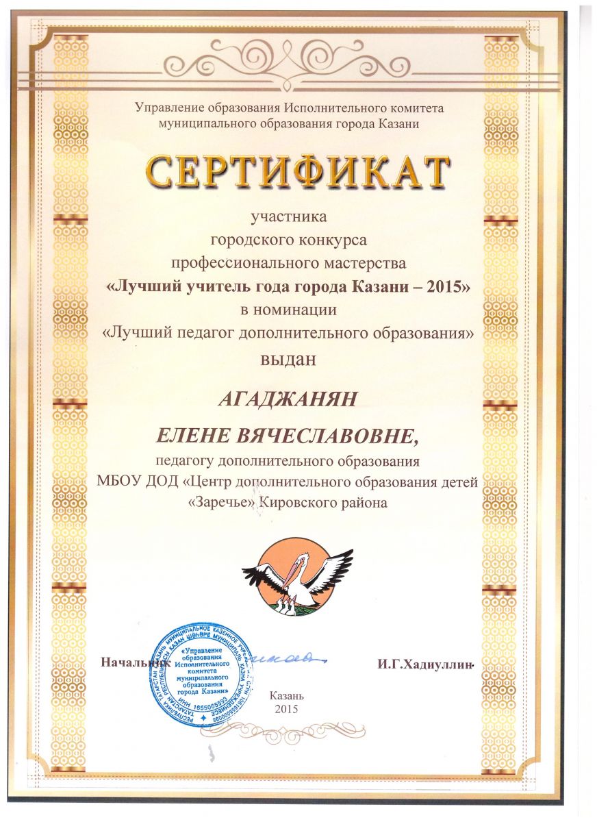 В рамках проведения городского конкурса "Лучший педагог -2015 года" с 26 января по 6 февраля прошел районный тур данного конкурса. Победителем районного этапа в номинации "Педагог дополнительного образования" стала педагог Центра дополнительного образования детей "Заречье" Агаджанян Елена Вячеславовна, руководитель объединения юных кинологов "Константа".