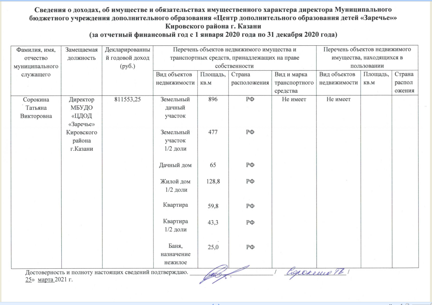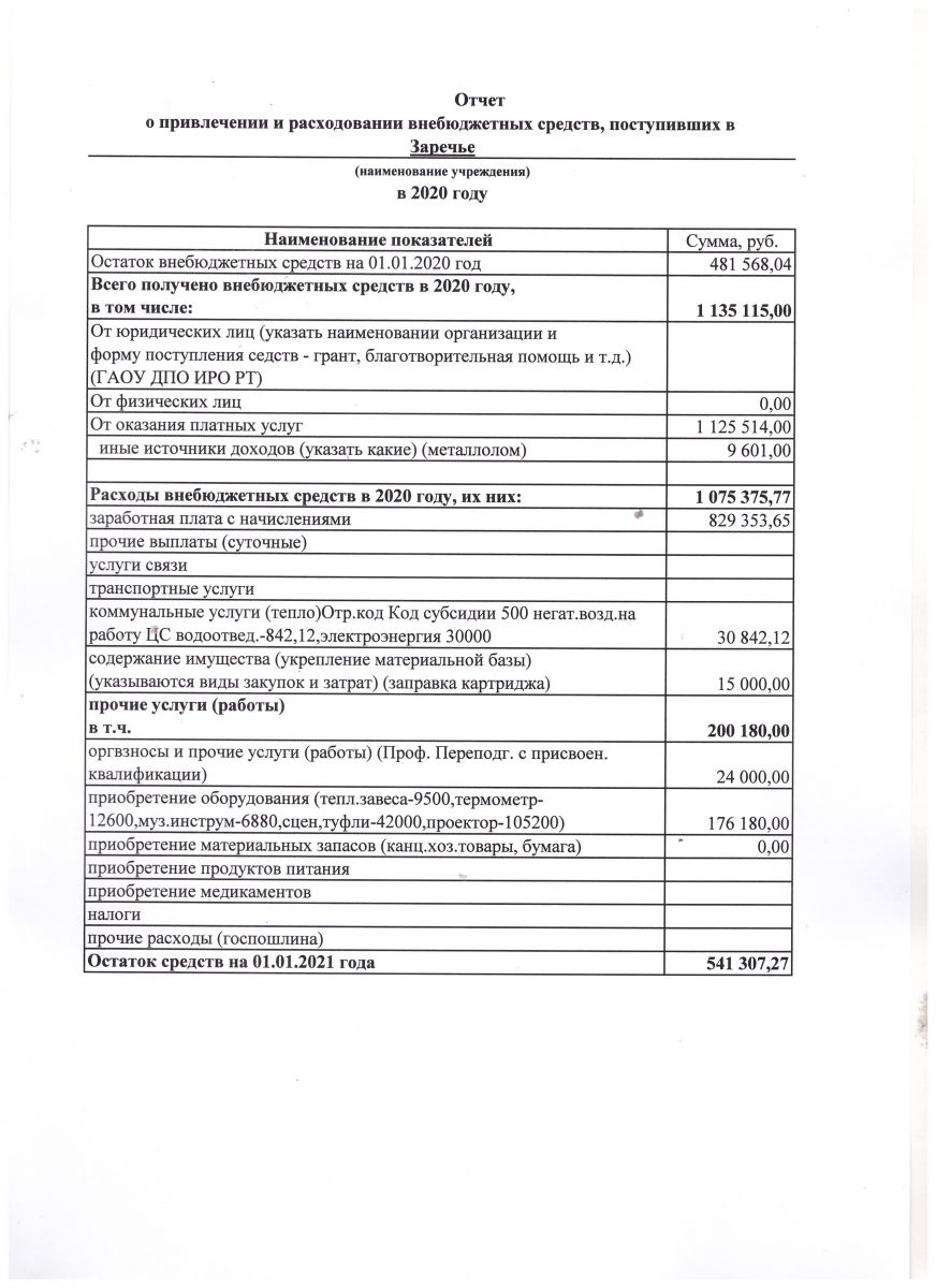 Отчёт о финансовых и материальных средствах за 2020 г. МБУДО «ЦДОД «Заречье»