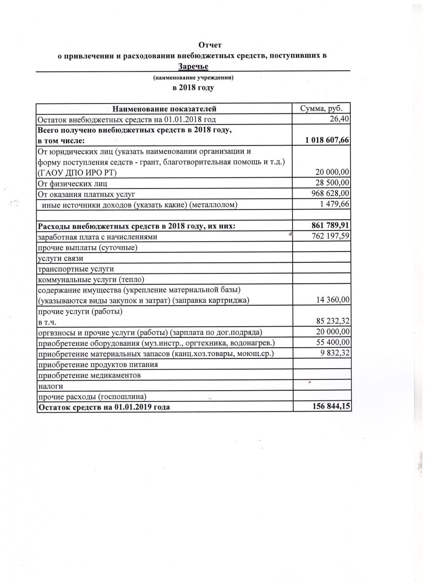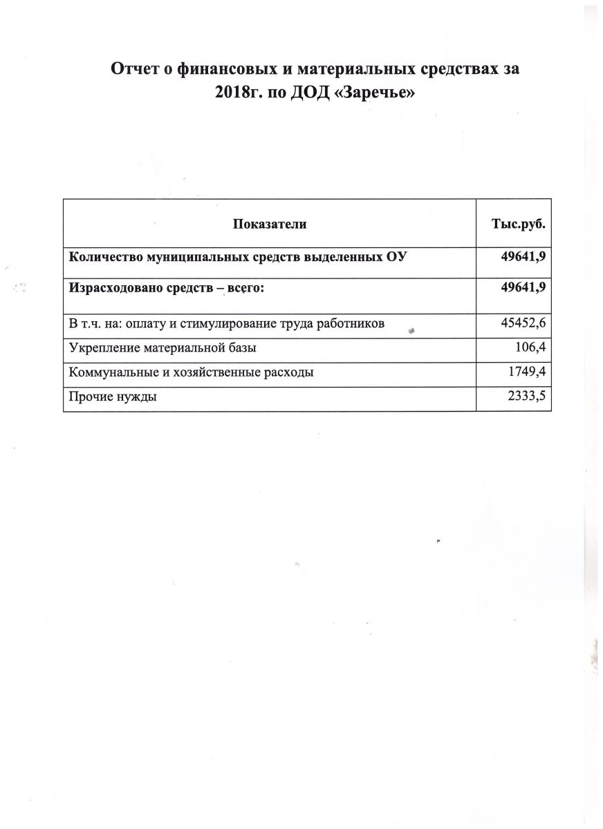 Отчёт о финансовых и материальных средствах за 2018 год по МБУДО "ЦДОД "Заречье"