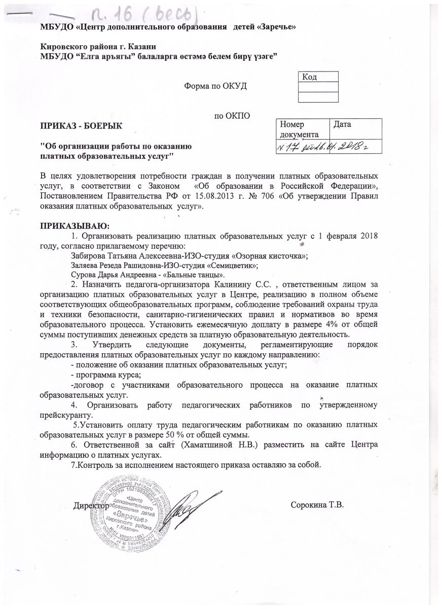 Приказ "Об организации работы по оказанию платных образовательных услуг"