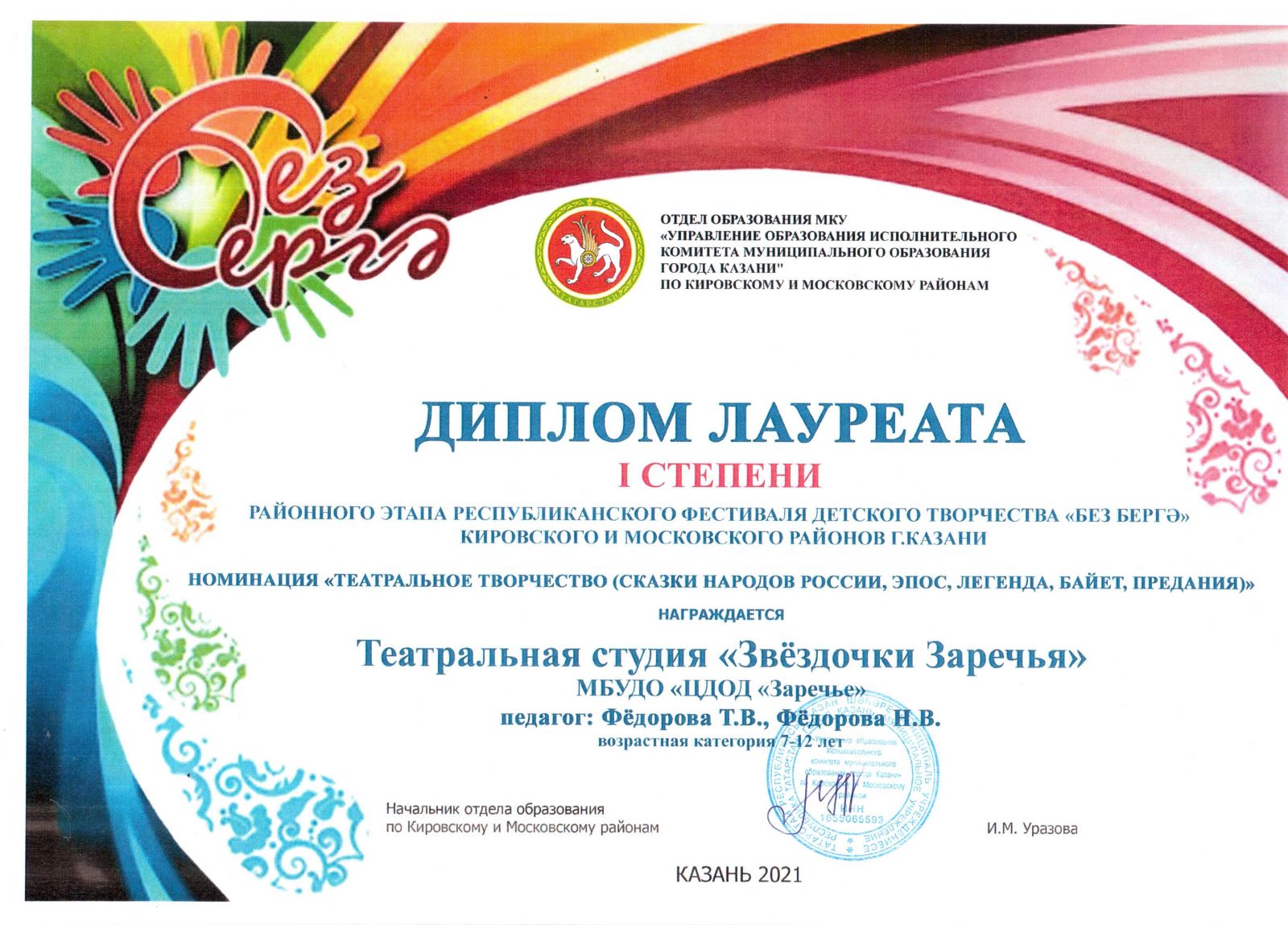 Диплом за 1 место Районного этапа Республиканского фестиваля «Без Бергә»