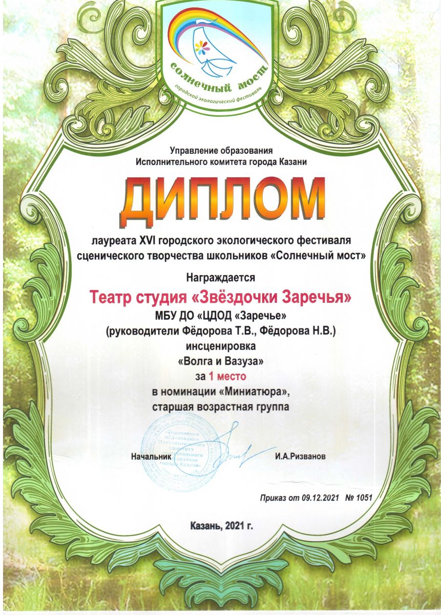 Диплом за 1 место в Городском фестивале сценического творчества «Солнечный мост»