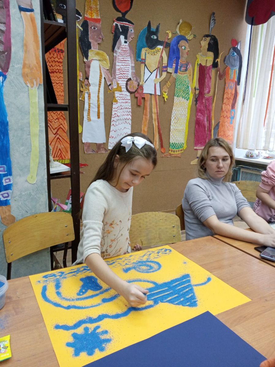 Опубликовано: 30.11.2022В объединении ИЗО «Ступени» в группе №3 (педагог Забирова Т. А.) прошло открытое занятие для родителей, где ребята обобщили свои знания о тайной стране Египет, познакомились с одним из видов современного искусства – рисунок песком или sand art. К занятию ребята готовились тщательно: рисовали декорации на стену, лепили круглую скульптуру, смастерили жуков скарабеев. А рисовать пустыню песком на тонированной бумаге вызвал у ребят огромный восторг и восхищение!