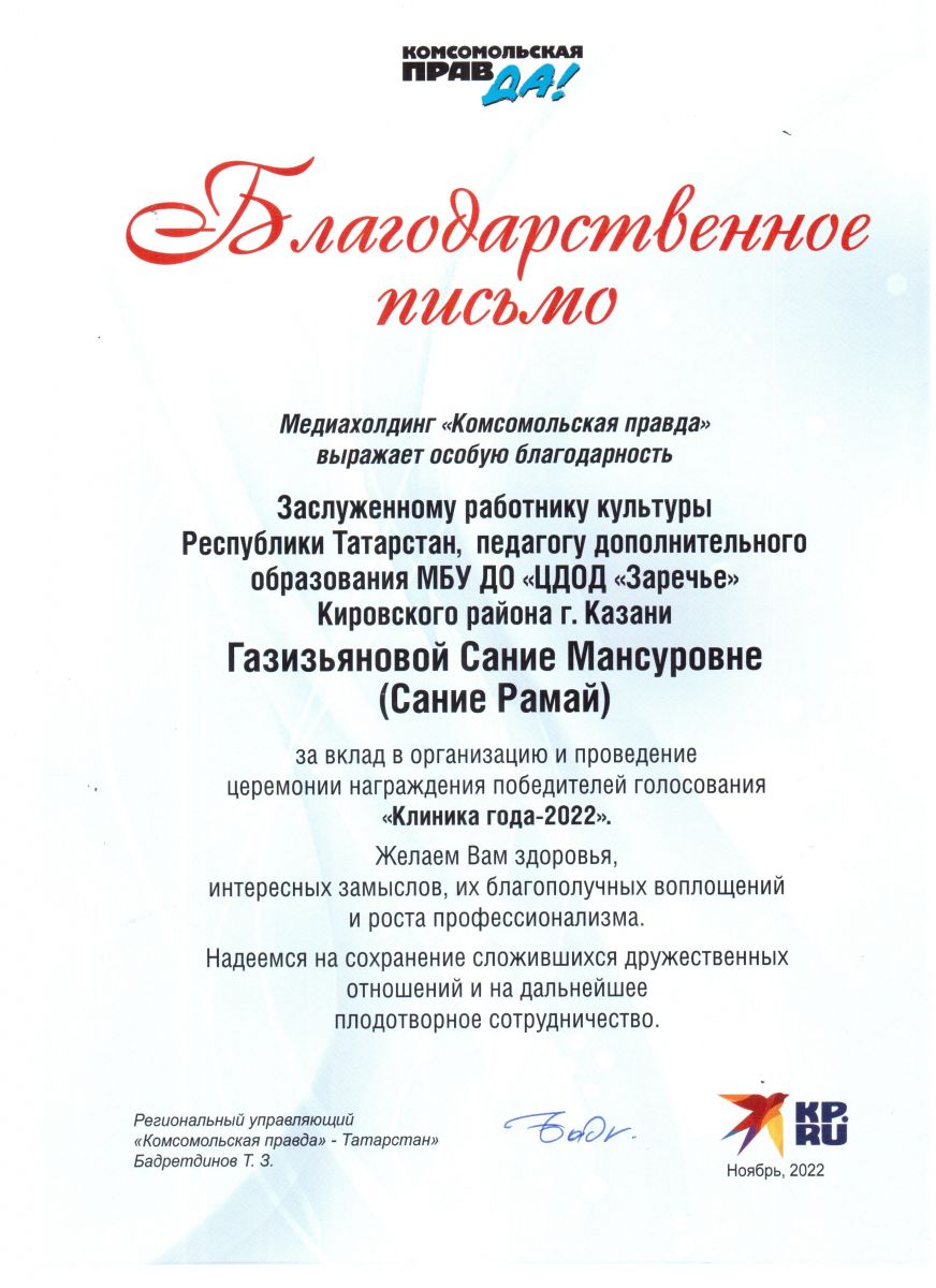 Опубликовано: 07.12.2022Наш педагог дополнительного образования - Газизьянова Сания Мансуровна (Сания Рамай) приняла участие в церемонии награждения победителей голосования «Клиника года-2022», где она выступила автором-исполнителем своих песен.