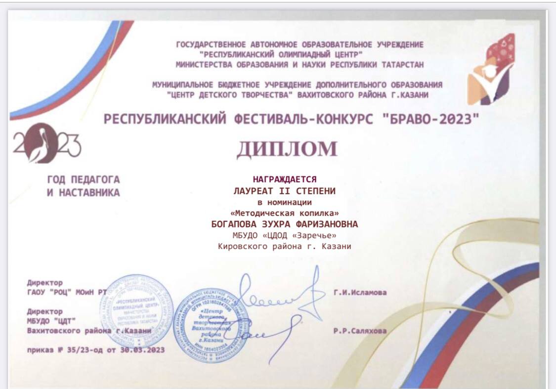 Опубликовано: 19.04.2023Поздравляем Богапову Зухру Фаризановну с победой в Республиканском фестивале-конкурсе «Браво-2023», посвященном Году педагога и наставника
