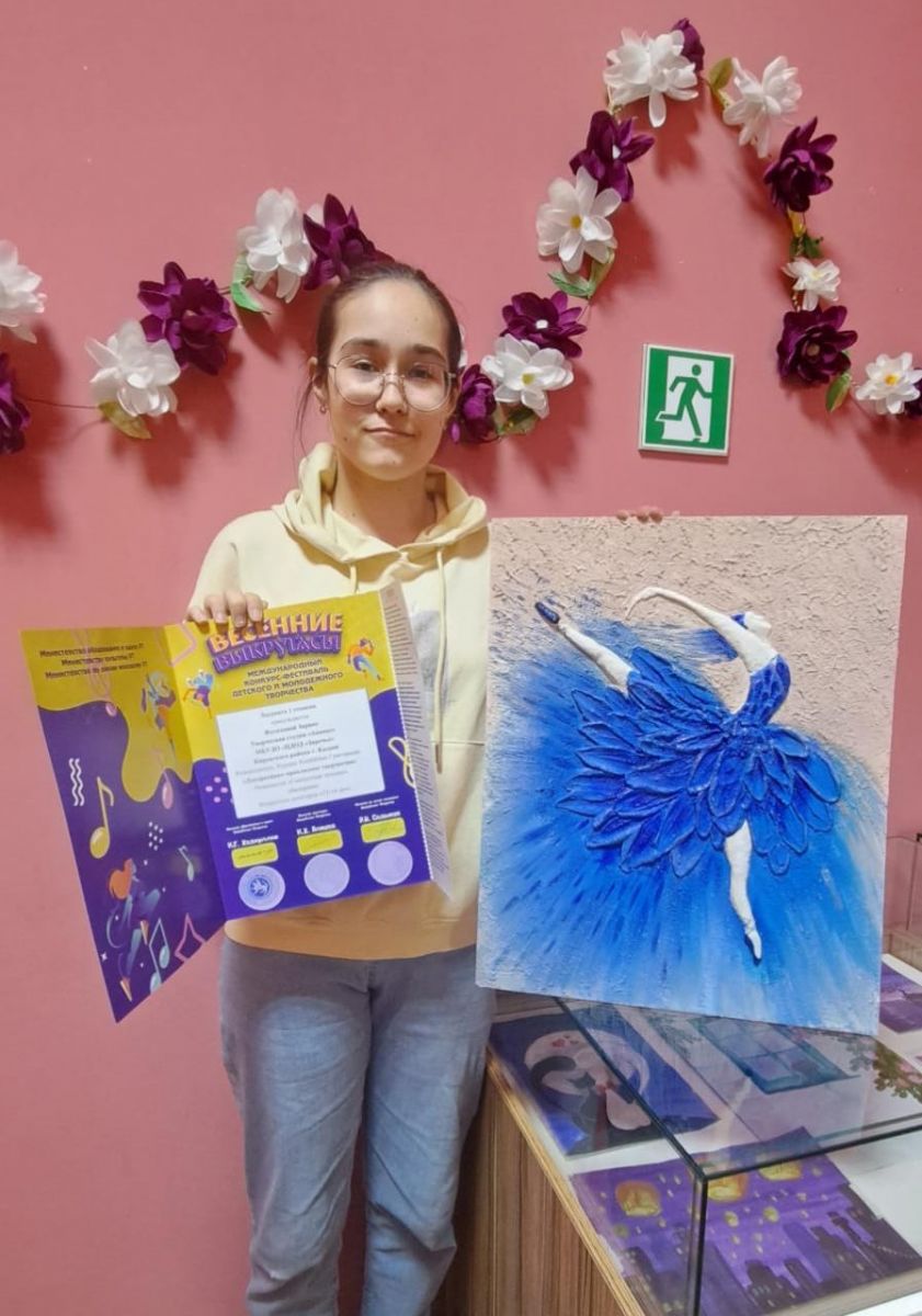 Опубликовано: 20.04.2023Поздравляем Фатихову Зарину из объединения «Творческая мастерская «Ананас» (руководитель Григорьева К.А.) с победой в Международном конкурсе-фестивале детского и молодежного творчества «Весенние выкрутасы - 2023»