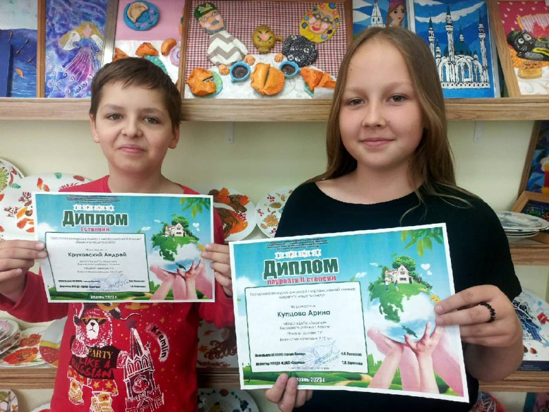 Опубликовано: 19.05.2023Поздравляем юных художников изостудии ОРАНЖЕВОЕ НЕБО Круковского Андрея и Купцову Арину (пед. Заляева Резеда Рашидовна) - победителей городского конкурса рисунка в нетрадиционной технике "Берегите нашу планету"!