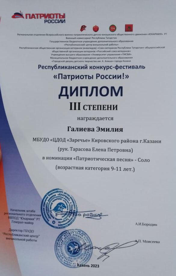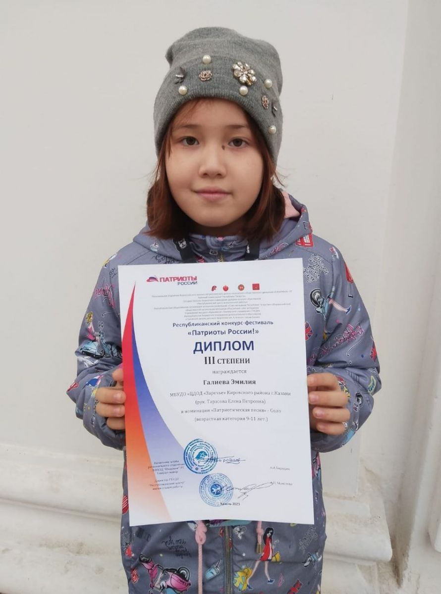 Поздравляем солистку вокальной студии "Исток" Галиеву Эмилию с почётным 3 местом Республиканского конкурса "Патриоты России". Желаем дальнейших творческих успехов и побед!