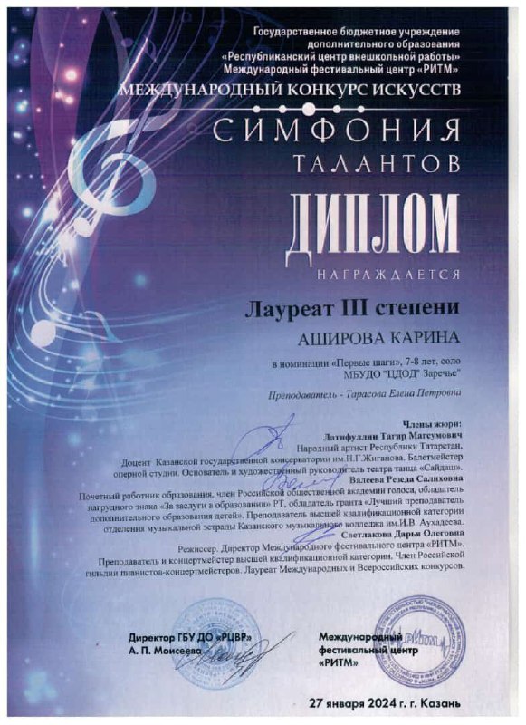Поздравляем Карину и пдо Тарасову Е.П. с очередной победой в Международном конкурсе "Симфония талантов". Желаем дальнейших творческих успехов.