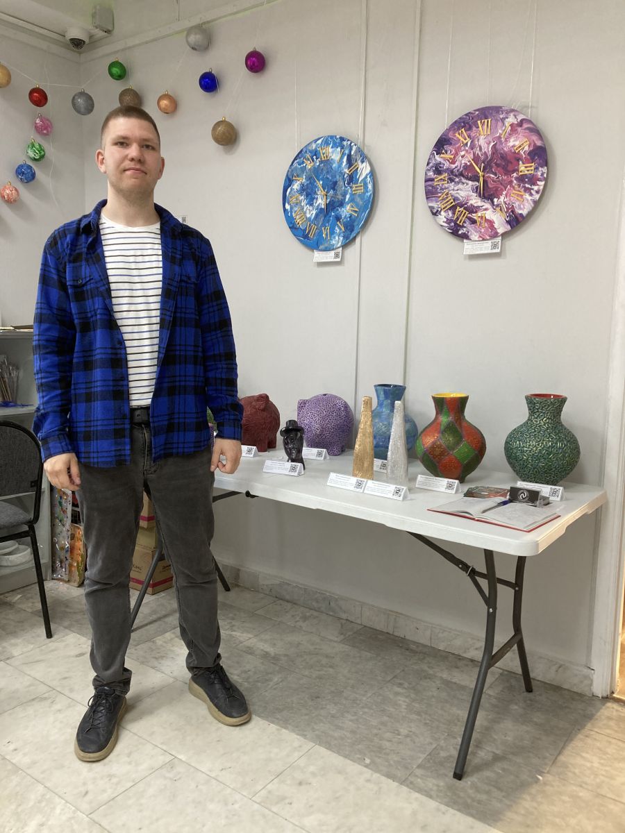 Опубликовано: 24.04.2024В галерее Ильдара Зарипова проходит персональная выставка педагога нашего Центра Агафонова Кирилла Эдуардовича. На выставке представлены произведения декоративно-прикладного искусства: настенные панно, часы, вазы, копилки и статуэтки.