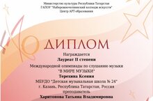 Поздравляем Терехину Ксению со званием Лаурета 2 степени Международной олимпиады по слушанию музыки "В мире музыки"