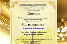 ♦ Ансамбль Горбачева Варвара и Каримуллина Диляра - Лауреат 3 степени. Преподаватель Ларина Вероника Владимировна. Концертмейстер Ёлгина Наталья Юрьевна;