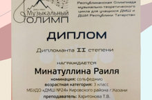 21 марта в ДМШ №20 Приволжского района г.КАзани состоялась Республиканская Олимпиада музыкально-теоретического цикла для учащихся ДМШ и ДШИ "МУЗЫКАЛЬНЫЙ ОЛИМП", где наша учащаяся Минатуллина Раиля приняла участие. В номинации "СОЛЬФЕДЖИО", Раиля удостоилась Дипломанта 2 степени. Преподаватель Харитонова Татьяна Владимировна. Поздравляем с хорошим результатом и желаем дальнейших творческих успехов и новых побед!