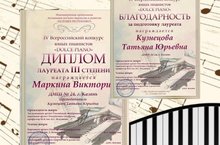 И вновь отличные результаты с конкуса. На этот раз поздравляем Маркину Викторию со званием ЛАУРЕАТА III степени во Всероссийском конкурсе юных пианистов "Dolce piano"