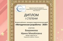 Поздравляем Вахрамееву Ирину Михайловну с отличным результатом - Лауреат 1 степени, во Всероссийском конкурсепедагогических идей "Методическая разработка - 2020". Рады, что наши педагоги в постоянном активном конкурсе, направляют и готовят к конкурсным выступлениям не только детей, но и развиваются сами. Желаем дальнейших достижений и новых побед!