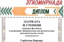 Поздравляем наших учащихся народного отделения с хорошими результатами в Международном конкурсе - фестивале традиционной культуры и народного художественного творчества "ЭТНОМИРИАДА". По итогам конкурса: Горбачева Варвара - Лауреат 2 степени, Тиханова Ангелина и Каюмова Ралина- Лауреаты 3 степени. Выражаем благодарность преподавателю Лариной Веронике Владимировне, концертмейстеру Ёлгиной Наталье Юрьевне за труд и большой вкалад в развитие наших детей! Желаем дальнейших творческих успехов!