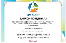 Поздравляем Ляшко Евгению Александровну с победой (2 место) во Всероссийском профессиональном конкурсе для педагогов "Дополнительное образование: проблемы, опыт, перспективы"!