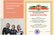 3 февраля 2021 года преподаватель хореографии Рамина Валиулловна Шафикова приняла участие в работе Республиканского практического семинара "Особенности проведения оздоровительных (фитнес) занятий с детьми 4-6 лет".