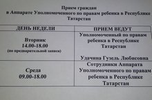 Запись на прием к Уполномоченному по правам ребенка в Республике Татарстан осуществляется по телефону: 8 (843) 236-61-64.