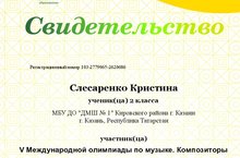 Ученица 2 класса фортепианного отделения Слесаренко Кристина (преп. Вафина Ф.Х.) приняла участие в V Международной олимпиаде по музыке, организованной Центром дополнительного образования "Снейл". Олимпиада посвящена творчеству Н.А. Римского-Корсакова, в ней приняли участие 312 человек.