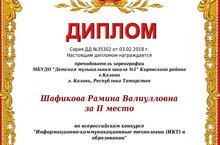 Также Рамина Валиулловна приняла участие во Всероссийском конкурсе «Информационно-коммуникационные технологии (ИКТ) в образовании», по итогам участия заняла 2 место.