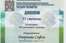 Поздравляем Дворнову Софью - дипломанта II степени Первой Международной Олимпиады по музыкальной грамоте и теории музыки "Четыре четверти". Софья участвовала в номинации "Исследователь музыки".