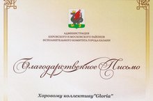Благодарственным письмом Администрации Кировского и Московского районов города Казани награжден хоровой коллектив "Gloria", руководитель - Крайнова Галина Анатольевна, концертмейстеры - Леонтьев Святослав Владимирович и Румянцева Марина Владимировна.