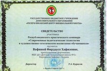 4 апреля преподаватель фортепиано Вафина Фирдауса Хафизовна приняла участие в республиканском научно-практическом семинаре "Современные педагогические технологии в художественно-эстетическом воспитании учащихся". Семинар прошел на базе Республиканского центра внешкольной работы.