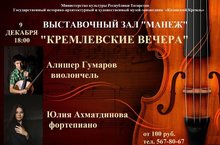 Сегодня в выставочном зале "Манеж" состоится очередной концерт цикла. Исполнители - Алишер Гумаров (виолончель) и студентка Казанской государственной консерватории, преподаватель и концертмейстер нашей школы Юлия Ахматдинова (фортепиано).