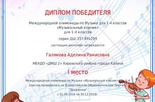 Поздравляем Галямову Аделину - победителя (1 место) Международной олимпиады по музыке 1-4 классов "Музыкальный ключик". Сергеева Агата - участник олимпиады.