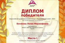10 мая подведены итоги Всероссийского профессионального конкурса "Педагогический олимп - 2015". Преподаватель по классу курая Бекмеева Лилия Мирзиафовна приняла участие в конкурсе в номинации "Педагогическое мастерство", представив Дополнительную общеразвивающую программу в области музыкального искусства "Основы музыкального исполнительства". Программа по учебному предмету "Музыкальный инструмент. Курай" и свою Визитную карточку.