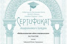 Преподаватель по классу фортепиано Зайцева Юлия Германовна приняла участие в общероссийском конкурсе "Какое гордое призвание...". На конкурс был представлен сценарий внеклассного мероприятия "День учителя". Конкурс проводился Информационно-Методическим центром МАУНЕД "Магистр".