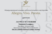 Поздравляем Хакимова Альфреда (преп. Вафина Фирдауса Хафизовна) - лауреата 2 степени Международного конкурса «Allegro. Vivo. Presto»!