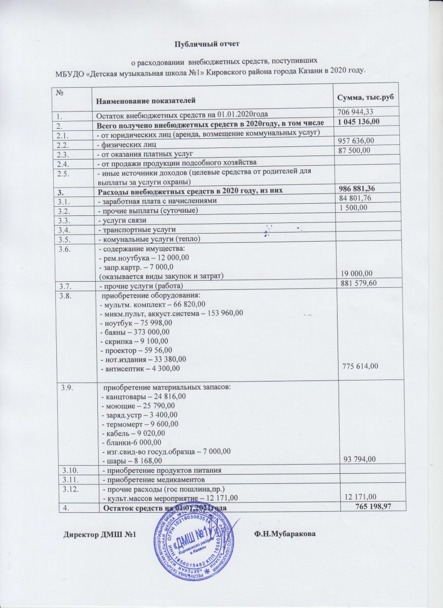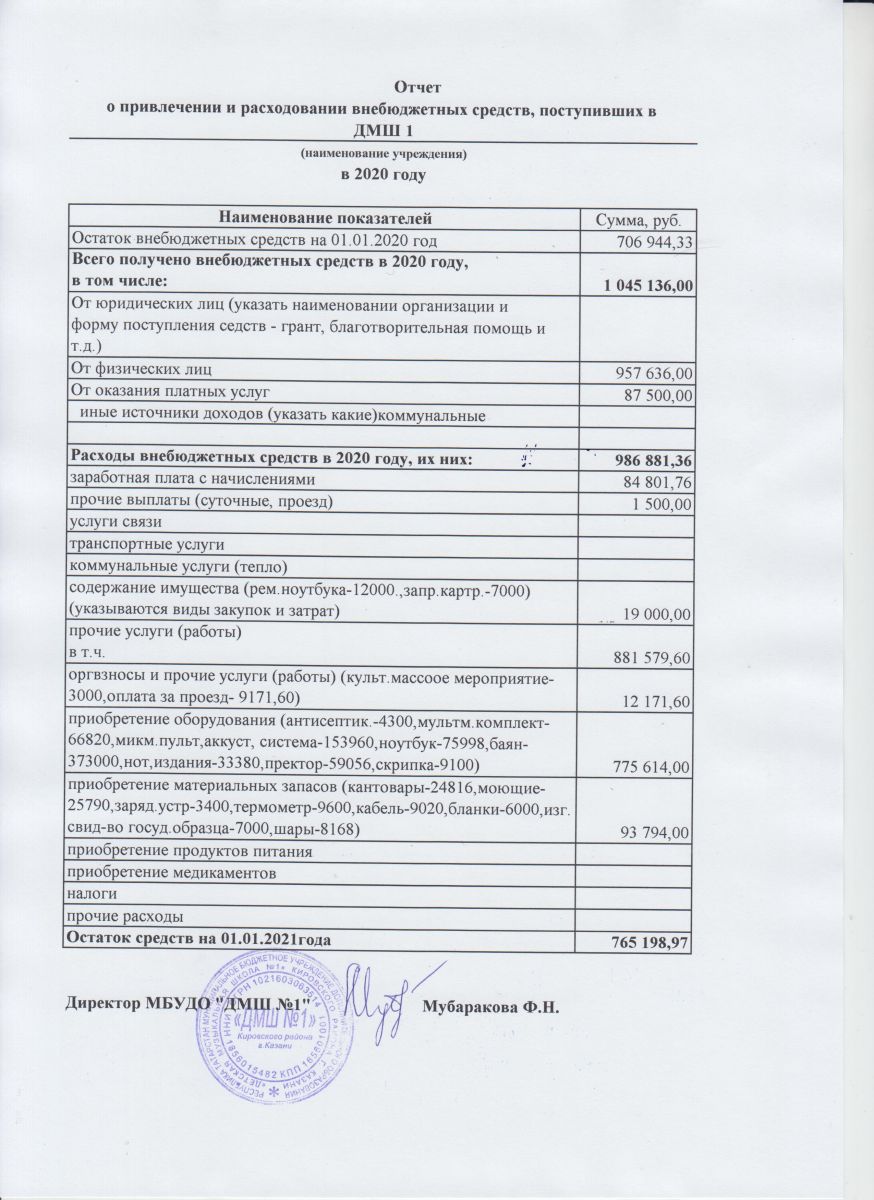 Публичный отчет о расходовании внебюджетных средств, посупивших в МБУДО "ДМШ № 1" в 2020 году