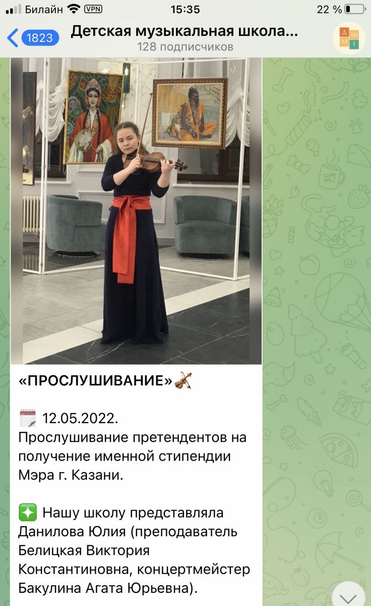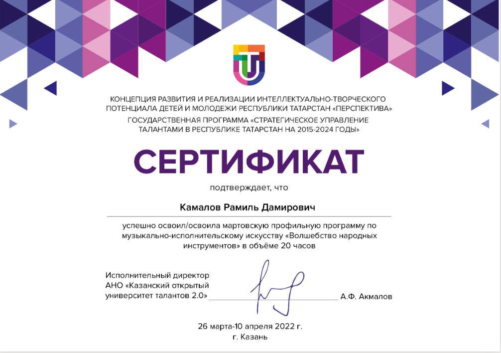 13. Профильная программа Университета талантов "Волшебство народных инструментов" (апрель, 2022). Участник - учащийся 6 класса Камалов Рамиль (балалайка), преп. Ахметшина Л.Х. ФОТО 1 ФОТО 2 ФОТО 3 Сертификат
