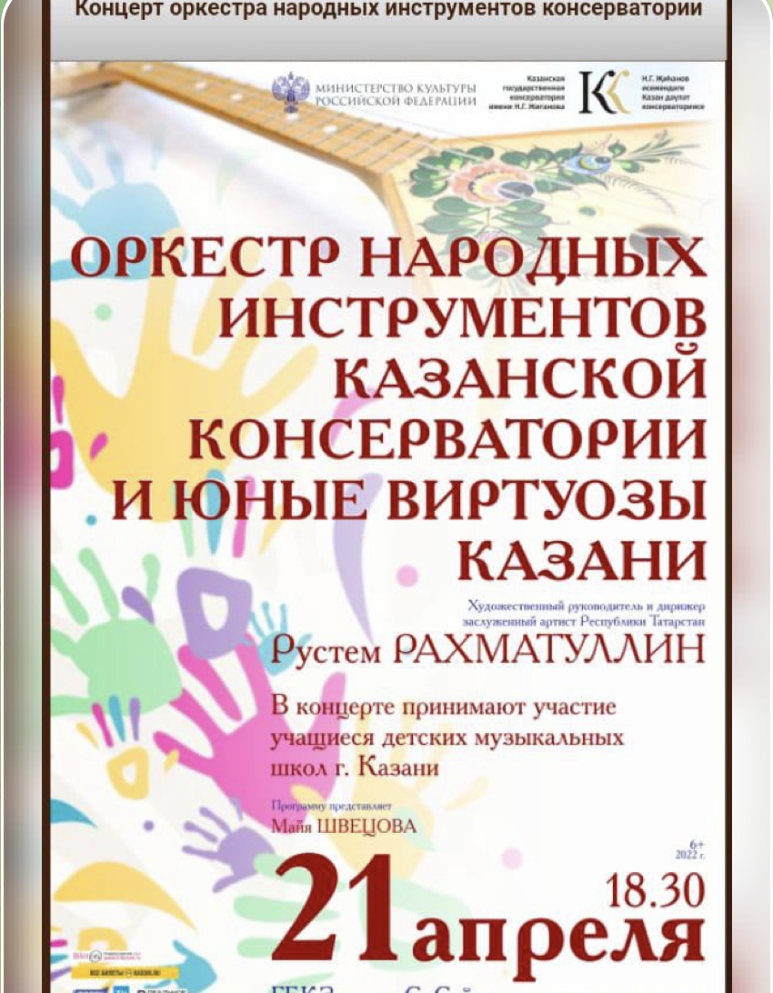 12. Концерт оркестра народных инстументов Казанской консерватории и юные виртуозы Казани. Выступление учащегося 7 класса Шатнова Камиля (преп. Настаушев А.М.). Место проведения - ГБКЗ им. С. Сайдашева. 21.04.2022. Афиша ФОТО