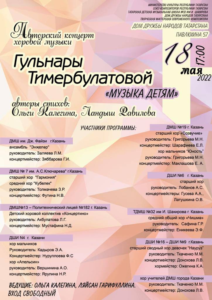 17. Авторский концерт хоровой музыки Гульнары Тимербулатовой "Музыка - детям". Место проведения - Дом Дружбы народов Республики Татарстан. 18.05.2022. В составе хора преподавателей ДМШ выступила Крайнова Г.А. Афиша