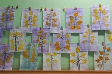 Осенние берёзки, нарисованные воспитанниками подготовительной к школе группы 12, с использованием нетрадиционной техники. -