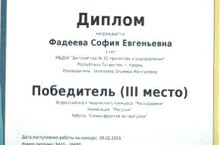 Фадеева София воспитанница детского сада приняла активное участие во Всероссийском творческом конкурсе "Рассударики" и заняла 3-е место в конкурсе по номинации "Рисунок" "Семья фруктов на прогулке" МОЛОДЕЦ СОФИЯ!!!