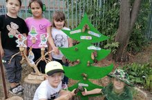 В летнее время наши воспитанники большую часть времени проводят на прогулке. Дети любят играть в экологическом уголке ребята вместе со сказочными героями-Эколята: Шалуном, Умницей, Елочкой и Тихоней, познают и изучают разнообразие животного и растительного мира, учатся жить в гармонии с ними. Елочка рассказывает о правилах поведения в природе. Умница много знает и рассказывает интересные истории. Шалун-очень любознательный эколенок. Тихоня - большой знаток цветов, показывает ребятам, как ухаживать за растениями на территории детского сада .