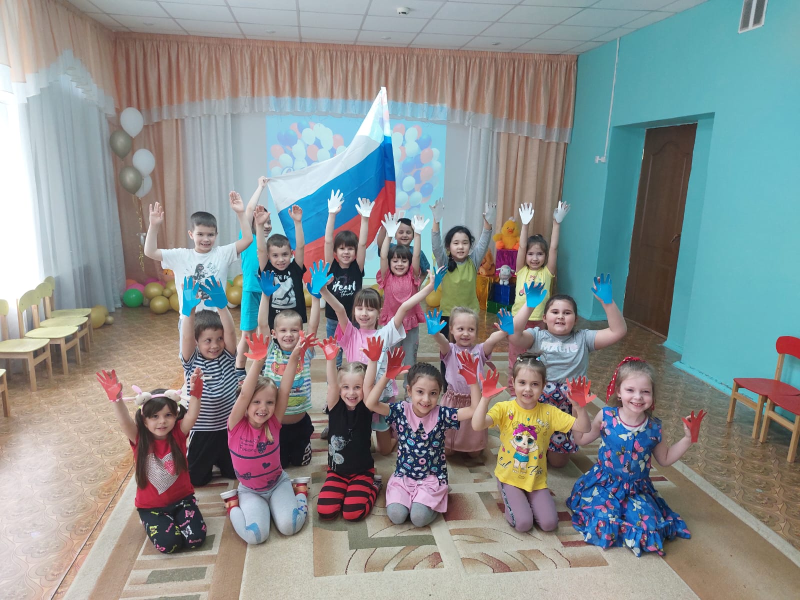 Сегодня в детском саду прошли мероприятия, посвященные Дню России. Воспитанники старшей и подготовительной групп приняли участие во флеш-мобе "Моя Россия", а также выполнили коллективную творческую работу.