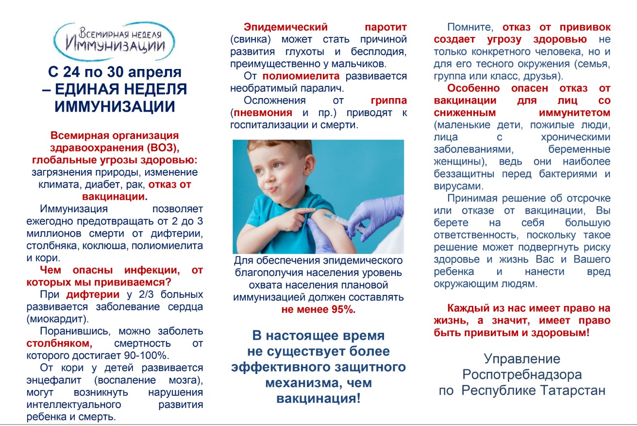 Министерство образования и науки Республики Татарстан сообщает о проведении Единой недели иммунизации (далее – ЕНИ-2022). Основная цель ЕНИ-2022 – повышение уровня знаний населения о важности иммунизации в предупреждении инфекционных заболеваний.