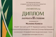 XIII Поволжском конкурсе эстрадного мастерства детских и юношеских творческих коллективов были награждены Дипломом лауреата второй степени музыкальный руководитель Ахметова Гульнара Мубараковна и воспитанница подготовительной группы Малкина Камила в номинации "Эстрадный вокал на русском языке - Соло".