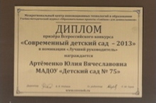Принимаем поздравления! 08.07.2013 Заведующая нашего детского сада - Артёменко Юлия Вячеславовна стала призёром Всероссийского конкурса "Современный детский сад -2013" в номинации "Лучший руководитель".
