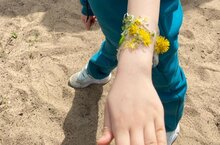 Дошколята продолжают экспериментировать с природным материалом, цветами и травами. Фантазии нет предела. Девочки сделали себе украшения - браслеты.