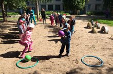 Спортивное развлечение "Королевство волшебных мячей". Дети средней и старшей групп соревновались в разных эстафетах с мячами.